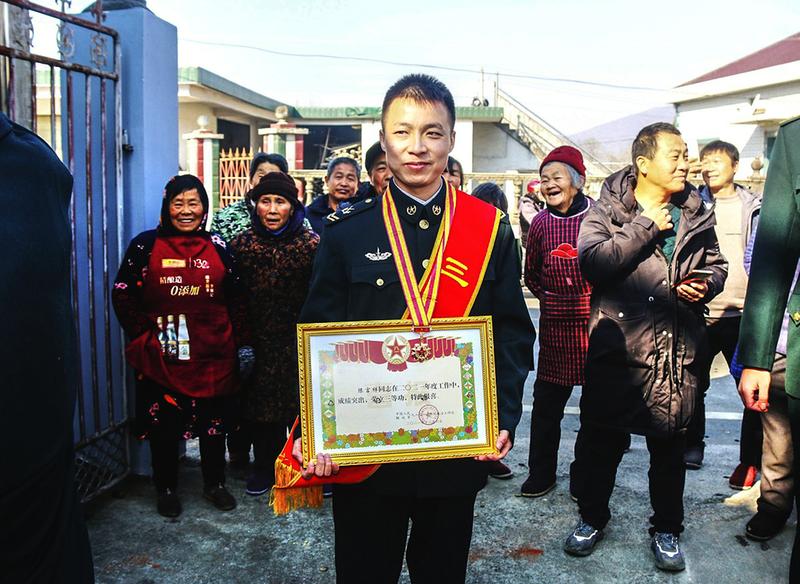 2021年12月30日上午,贵池区牌楼镇陈言祥家十分热闹。原来陈言祥在中国人民解放军火箭军某部服役的12年期间,由于综合成绩突出,荣立个人三等功。为表彰功臣,弘扬正能量,在贵池区人武部和牌楼镇镇村相关负责同志陪同下,部队官兵将立功喜报敲锣打鼓送至陈言祥家中,同时送去奖金。通讯员潘秀来摄