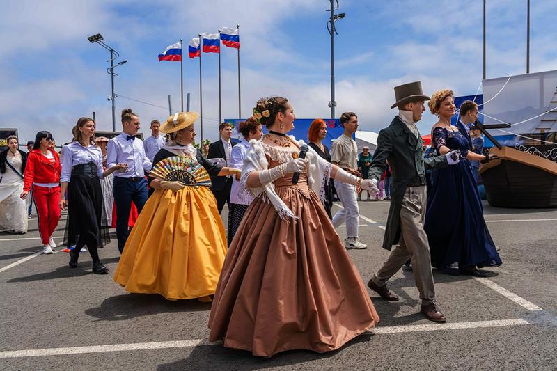 6月12日,在俄罗斯符拉迪沃斯托克市中心广场,人们身着传统服饰参加舞蹈表演