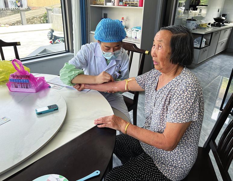 近日,区第二人民医院和殷汇镇东溪村联合组织开展免费健康体检活动,为该村65岁以上患慢性病老人及脱贫户提供免费体检服务。图为医务人员上门为行动不便的老人开展健康检查。通讯员陈丽霞摄