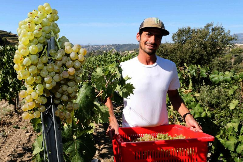 8月23日,工作人员在法国尼斯一家酒庄的葡萄园收割葡萄。