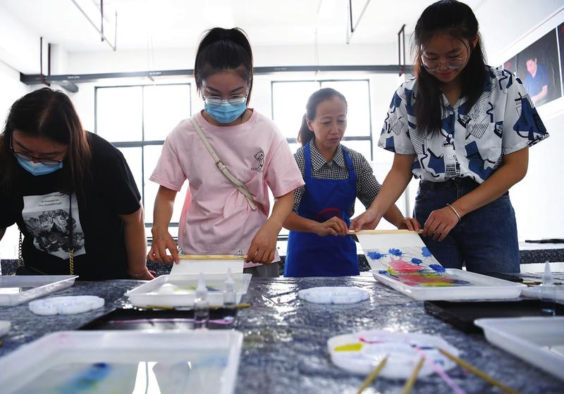 9月8日,在纸笺加工技艺传习基地,爱好者在体验流沙笺的制作工艺。