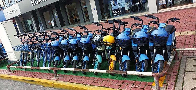 共享单车在专用车位上整齐停放