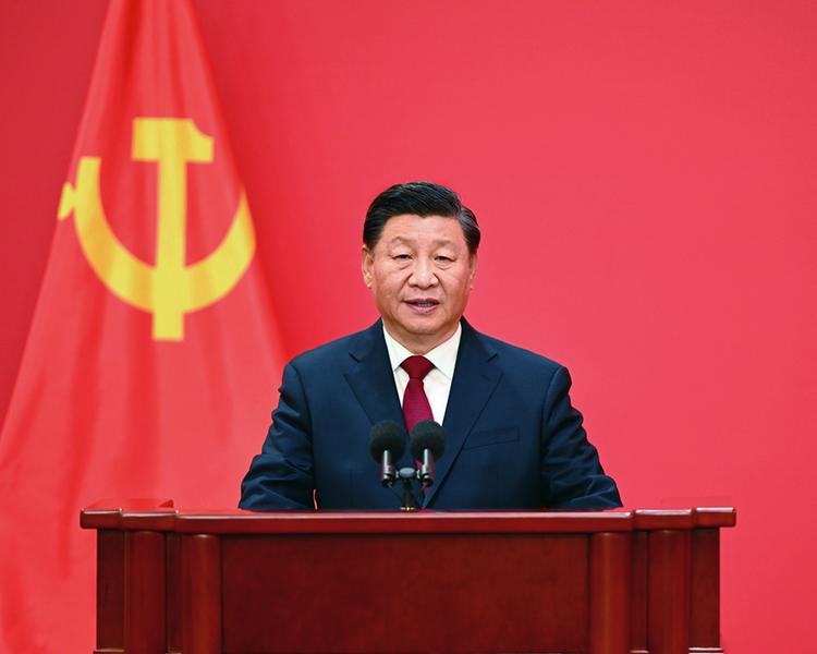 10月23日,刚刚在中国共产党第二十届中央委员会第一次全体会议上当选的中共中央总书记习近平和中共中央政治局常委李强、赵乐际、王沪宁、蔡奇、丁薛祥、李希在北京人民大会堂同采访中共二十大的中外记者亲切见面。这是习近平发表重要讲话。
