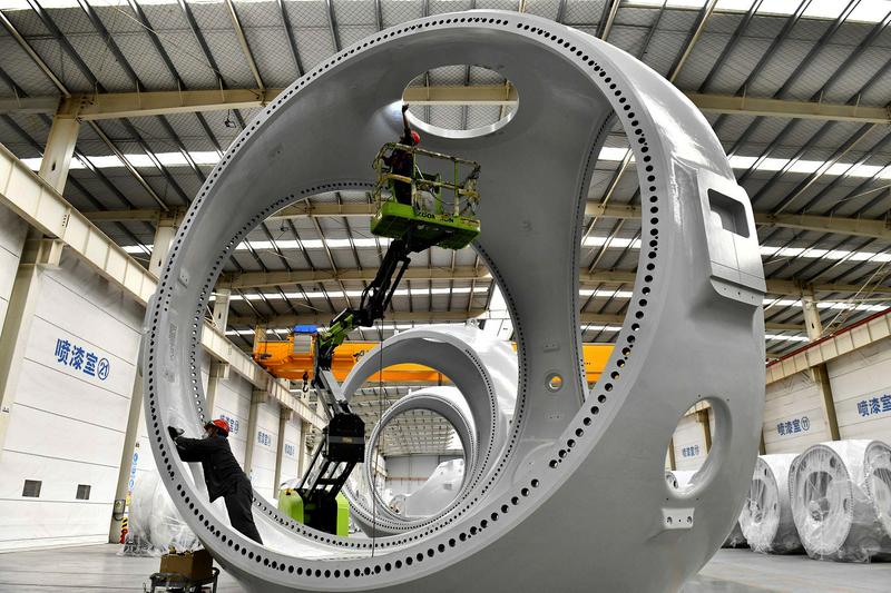 ▲在山东省惠民县风电装备产业基地涂装车间,工作人员对风电轮毂进行涂装(2022年6月7日摄)。