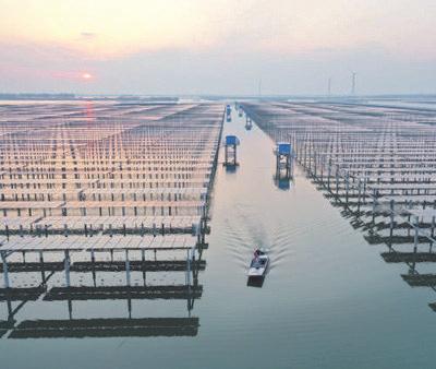 ◀工作人员在江苏省泗洪县天岗湖光伏发电产业基地乘船巡检。 方东旭摄(影像中国)