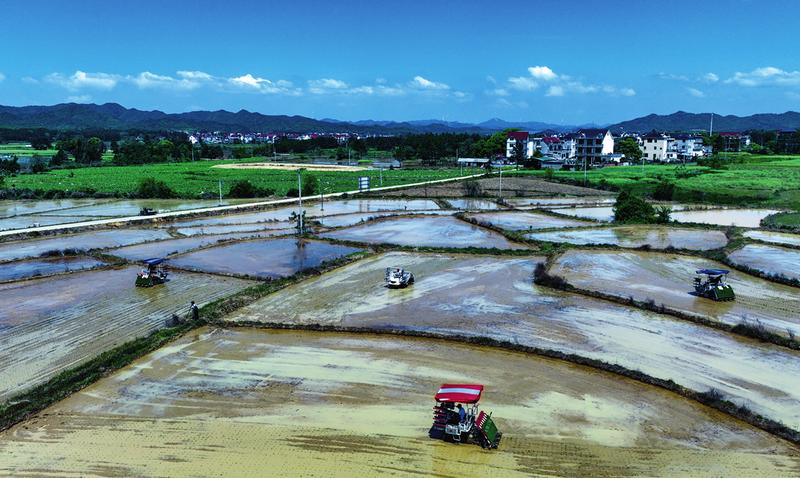 近年来,东至县着力落实藏粮于地、藏粮于技战略,加快补齐农机装备短板,积极推进水稻机械化插秧技术代替人工栽插秧,从根本上解决了日益突出的“栽秧雇工难、用工成本高”的矛盾,达到了省工、节本、增产、增收的显著效果。图为近日龙泉镇华仁家庭农场里,几台插秧机正在田间忙碌。