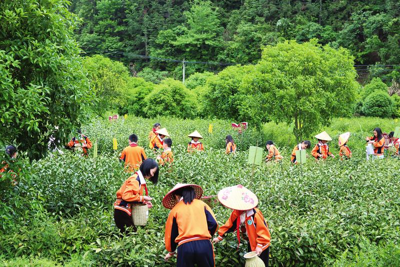 本次活动以“珍爱地球,人与自然和谐共生”为主题,旨在通过研学观摩、劳动体验等形式,激发学生“爱家乡,爱自然”的情感。图为实小师生们在西黄山茶博园亲身体验采茶过程。通讯员汪自如摄