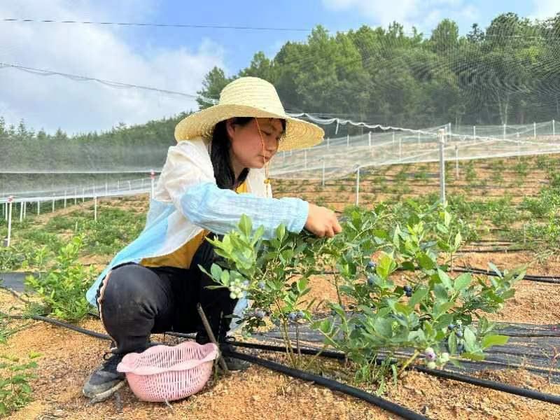 在东至县张溪镇兰田村蓝莓种植基地,游客正在体验采摘乐趣