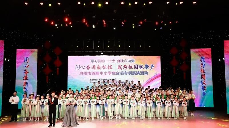 为深入学习宣传贯彻党的二十大精神,深化理想信念教育,厚植爱国主义情怀,教育引导广大青少年从小坚定听党话、感党恩、跟党走的决心,建设向真、向善、向美、向上的校园文化,7月15日下午,池州市举行首届中小学生合唱专项展演,4个组别19个优秀合唱作品进行展演,参演学生达750余人。