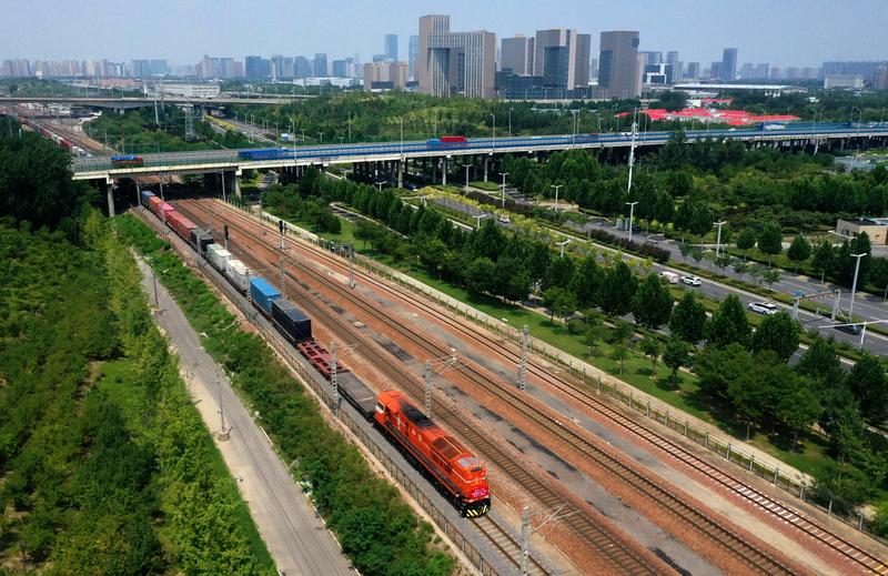 7月18日,X8003次中欧班列(中豫号)驶出国铁集团郑州局圃田车站(无人机照片)。