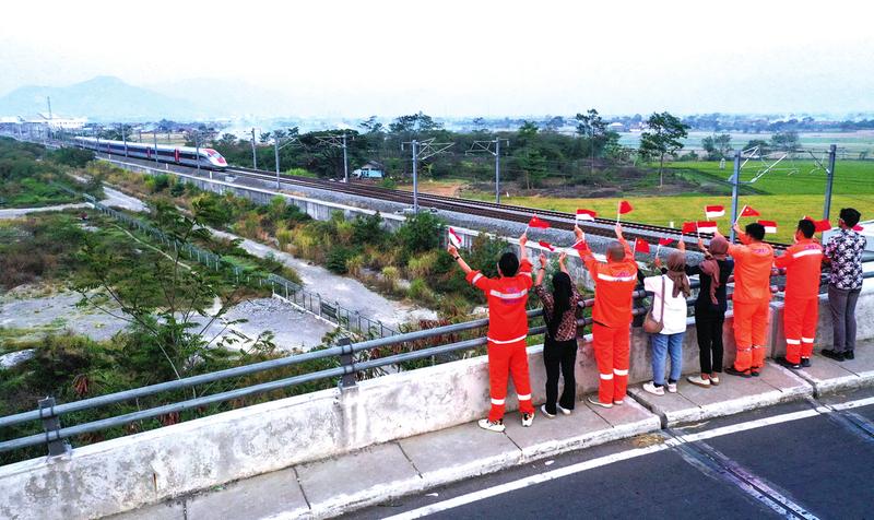 10月17日,在印度尼西亚万隆一座天桥上,雅万高铁建设单位之一中铁电气化局的中国和印尼籍员工挥舞着中国和印尼两国国旗,向远处驶来的一列雅万高铁高速动车组列车欢呼(无人机照片)。 新华社记者 徐钦 摄