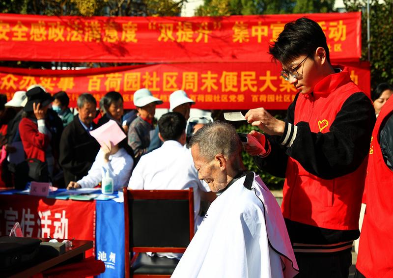 为弘扬爱老敬老的中华传统美德,10月23日,贵池区清风街道百荷园社区开展“爱在金秋欢度重阳”便民服务进社区活动,组织志愿者为社区周边老年人提供防诈宣传、爱心义诊、免费理发等便利服务。