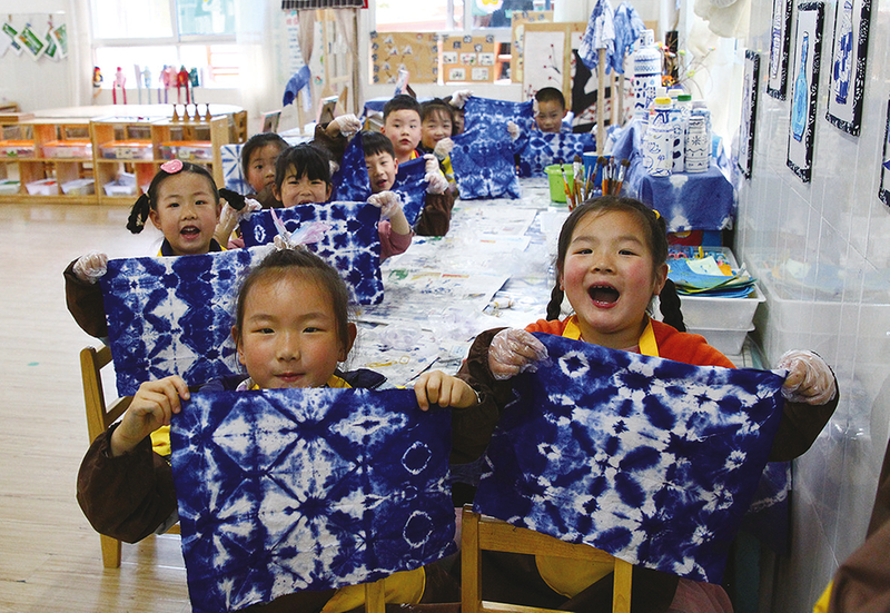 我市聚焦群众急难愁盼问题,扎实做好安心托幼等10项暖民心行动。图为贵池幼儿园小朋友们展示学习扎染课程成果。