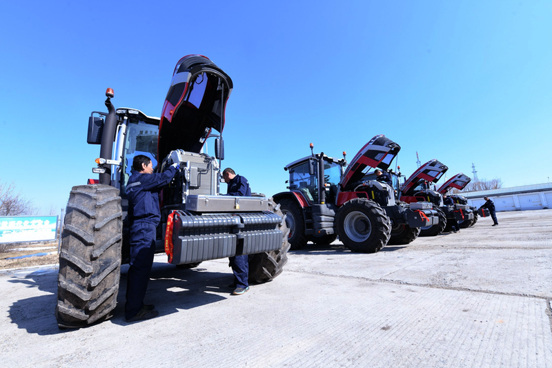 3月22日,在北大荒集团建设农场有限公司,农机手对新引进的拖拉机进行调试。