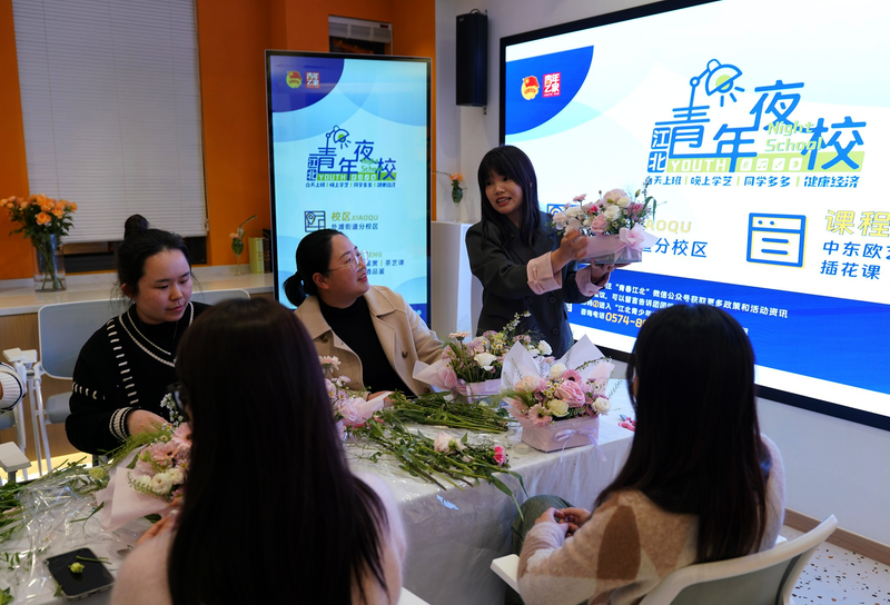 3月20日,浙江省宁波市江北区青年夜校外滩街道分校区,夜校老师(右二)在插花课上教插花。
