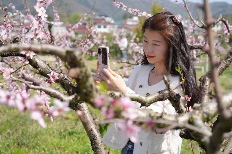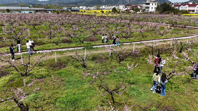 桃之夭夭,灼灼其华。近日,位于青阳县庙前镇的九华贡果生态园内数百亩桃花竞相开放,宛若一片粉色海洋,吸引大量游客前来打卡拍照,感受春天气息。