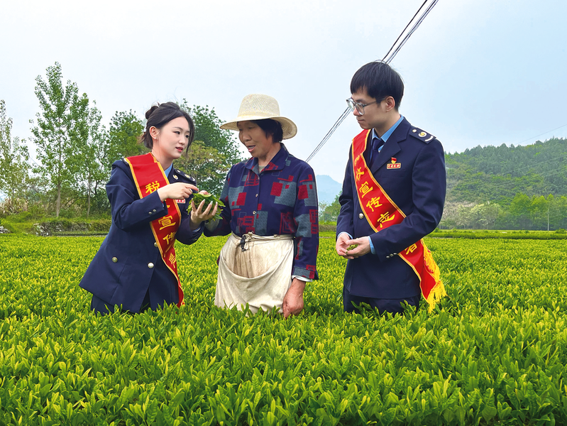 今年4月是第33个全国税收宣传月。连日来,县税务局工作人员深入田间地头,为村民们送去涉农税费政策,并提供多项涉税业务远程帮办服务。图为税务工作人员在茶园了解农户生产经营情况。