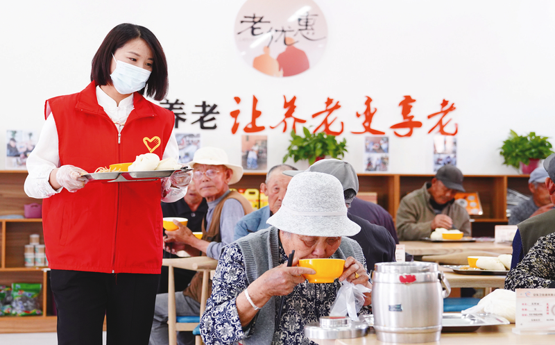 5月10日,在日照市岚山区安东卫街道凤凰山社区养老服务中心,志愿者在为老人端饭。 新华社记者 郭绪雷 摄