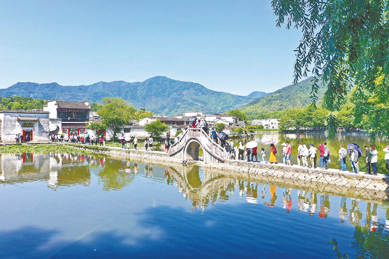 初夏时节,黟县宏村景区碧水、绿树与徽派古民居相映成趣,宛若画卷。图为游客在宏村参观游玩。