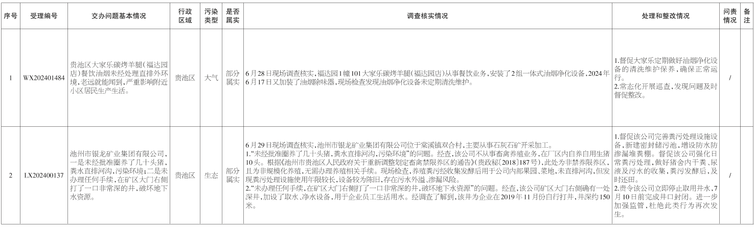 安徽省第一生态环境保护督察组6月27日(第二十六批)交办我市的2件信访件,截至7月3日,已办结1件。经查,基本属实的0件、部分属实的2件、不属实的0件;责令整改1件、立案处罚0件、拘留0人、问责0人、约谈0人。