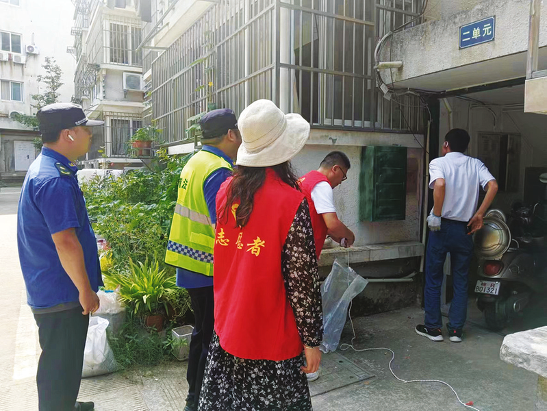 ▲社区联合城管、物业、志愿者一起对城北花园小区飞线充电进行集中整治。