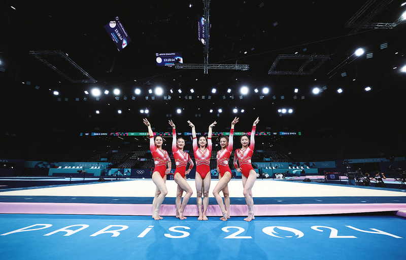 中国女子体操队在巴黎贝尔西体育馆进行赛台训练
