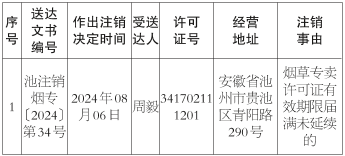 依据《烟草专卖许可证管理办法》第四十八条第一项规定,我局决定依法注销你持有的烟草专卖零售许可证(许可证号:341702111201),注销理由是:烟草专卖许可证有效期限届满未延续的。