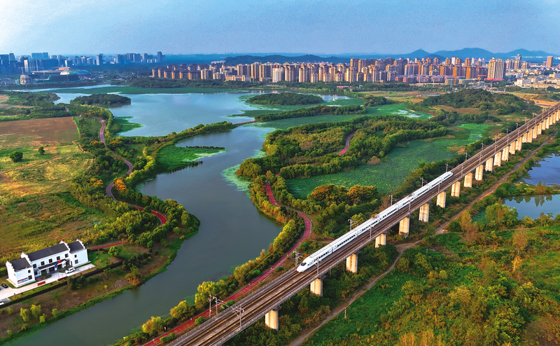 图为主城区天堂湖新区,一辆高速列车在疾驰。
