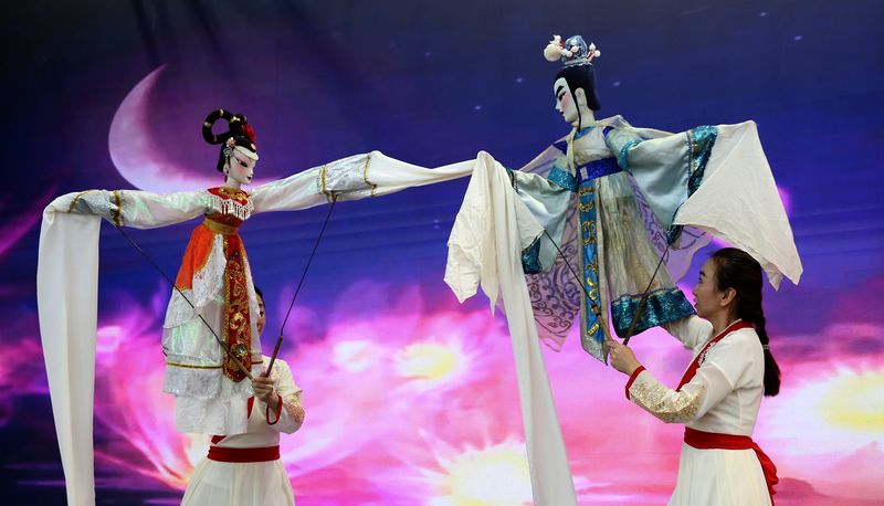 中国木偶艺术剧院的演员为现场观众表演经典木偶剧《梁祝》