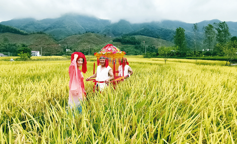 秋日的库山村,数百亩梯田层层叠叠尽染金黄。当地群众身着盛装,参加“丰收大典”祭祀祈福。田园舞台间,他们时而载歌载舞,时而奏乐演唱,尽情展示劳作的快乐和丰收的喜悦。