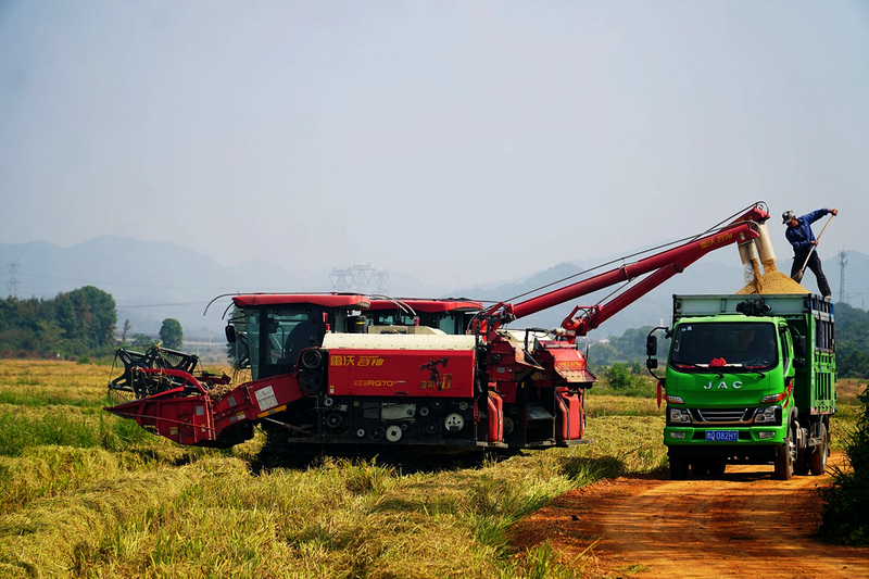 农业机械成为秋收的“得力助手”,为秋粮颗粒归仓按下“快进键”。“这里一共有300亩稻子,3天就能收完。实行机械化作业就是为了往前抢时间,我们要抢种冬油菜和小麦。”据童济舟介绍,以前这300亩地需要20多人去种,现在全程机械化之后只需要四五个人。“今年,播种、施肥、除草、除虫等田间农事,我全部采用无人机进行作业,生产效率提高30%以上。”童济舟说,去年他从杭州辞职返乡,承包土地种植水稻,并实行全程机械化作业。今年,他在自己的承包地里搞起了“试验”,对旱优73、F两优1252等5个水稻新品种的产量和适应性进行“检验”,为来年选定高产稳产的优质品种掌握第一手资料。