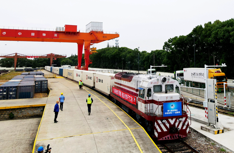 自2021年“进博号”开行以来,中欧班列与进博会紧密联系,为欧洲及沿线国家企业参展提供新通道,成为“展品变商品”的高服务品质路径选择。新华社记者 方喆 摄