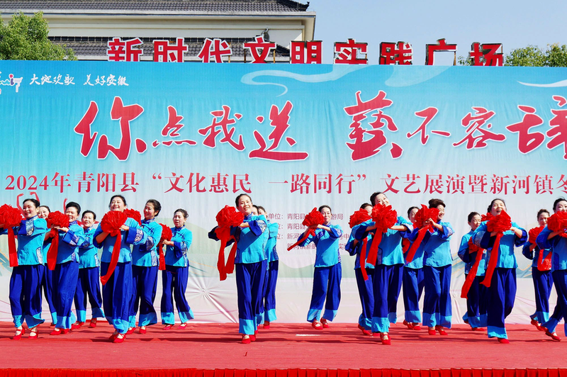 近日,2024年青阳县“文化惠民 一路同行”文艺展演暨冬季“村晚”活动首场演出在新河镇法治广场举行。演出节目涵盖舞蹈、歌曲、朗诵、青阳腔、九华民歌等,进一步丰富了基层群众精神文化生活。图为舞蹈表演现场。