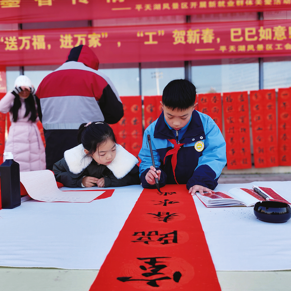 ▲贵池区永明小学402班李子沐同学在老师的带领下,参加由平天湖管委会举办的“墨香传情 新春送福”活动,为新就业群体写春联。