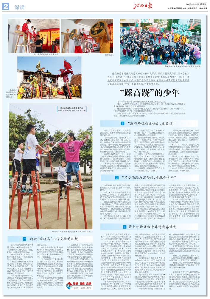 “看着他演出时的精气神,我知道他是真心喜欢踩高跷马。”包慧琴告诉记者,春节放假期间,只要孩子有表演,她都陪在旁边,这也让她更加深入地了解了高跷马,也愿意支持孩子的爱好。