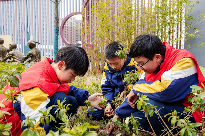 图为植树现场,学生们在社区志愿者指导下栽种映山红树苗。