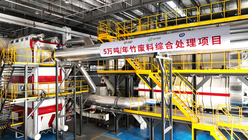 “这是全国首台套全竹资源化热解成套设备,过去一根毛竹做成竹制品我们只利用了30%,剩下的只能当作废料卖掉。现在竹片在进行深加工制成‘以竹代塑’产品之后,产生的竹屑、竹废料还可以进一步被加工成为活性炭、固态电池用硬炭负极材料和生物炭纤维。”鸿叶集团副总经理杨德震介绍,竹屑热解过程中产生的蒸汽还可以再利用,能有效节约能源、降低生产成本。