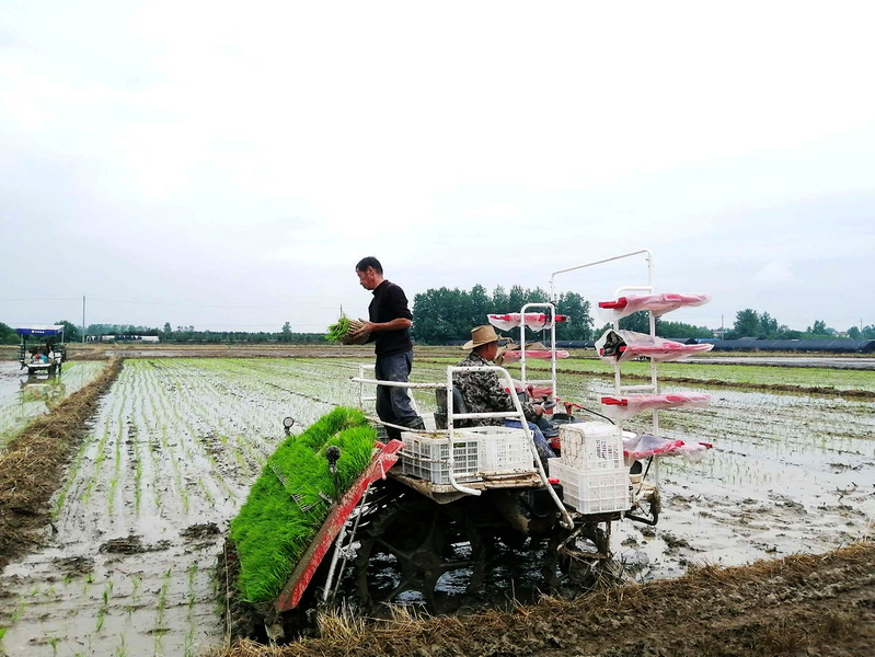 图为香隅镇老虎岗村国珍家庭农场里,插秧机正进行水稻栽插。