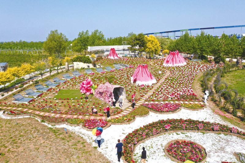 5月11日,游客在山东省青岛市即墨区灵山街道“玫瑰小镇”产业园观光(无人机照片)。