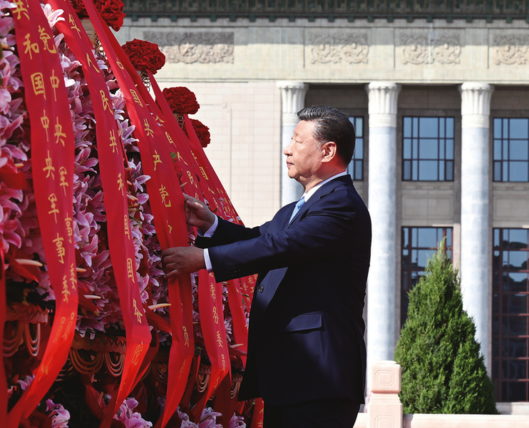 9月30日上午,党和国家领导人习近平、李强、赵乐际、王沪宁、蔡奇、丁薛祥、李希、韩正等来到北京天安门广场,出席烈士纪念日向人民英雄敬献花篮仪式。这是习近平整理花篮上的缎带。 新华社记者 李响 摄