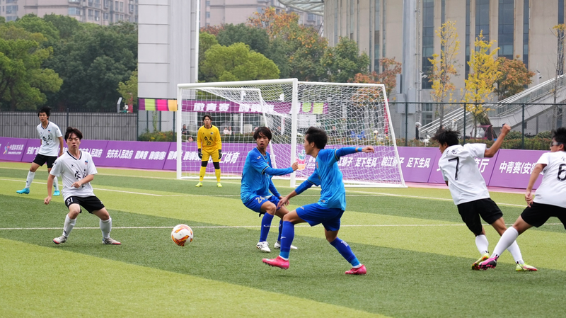 本场比赛池州队小将们展现出良好的竞技状态,攻防两端配合默契。开场不到5分钟,池州队便率先攻破对方球门,为比赛胜利奠定基础。图为两队队员在激烈拼抢。