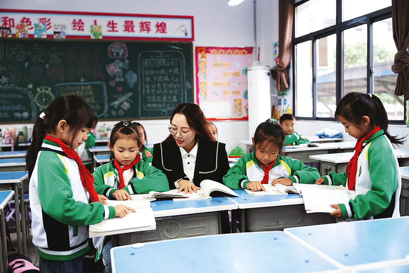 青阳县蓉城镇中心小学教师杜慧在为孩子们做作业指导。