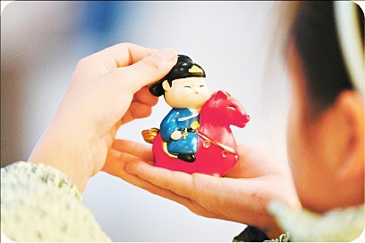 在山东滕州博物馆文创商店,一名小朋友选购“踏马游春”文创摆件。