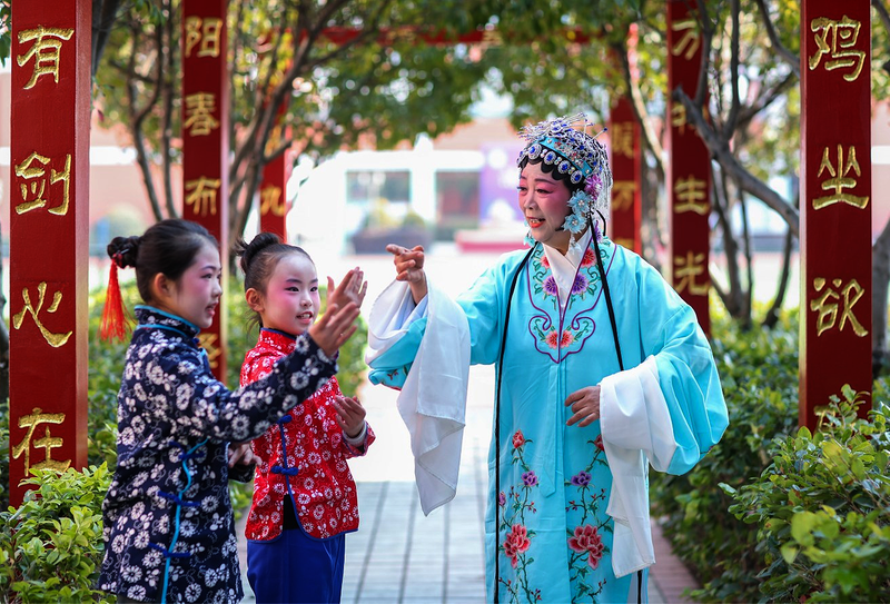 2月8日,在江苏省泰州市姜堰区城西学校教育集团城西小学校区公益寒托班上,戏曲老师指导学生练习戏曲基本动作。 新华社发(周社根 摄)