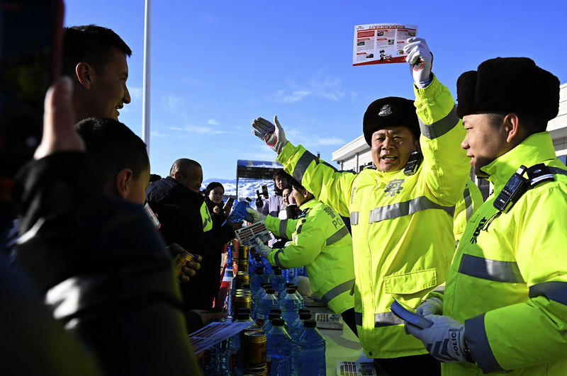 2月2日,在乌尉高速公路永丰服务区,乌鲁木齐市公安局交管支队乌拉泊大队民警向过往司乘人员进行安全出行宣传。新华社记者 王菲 摄